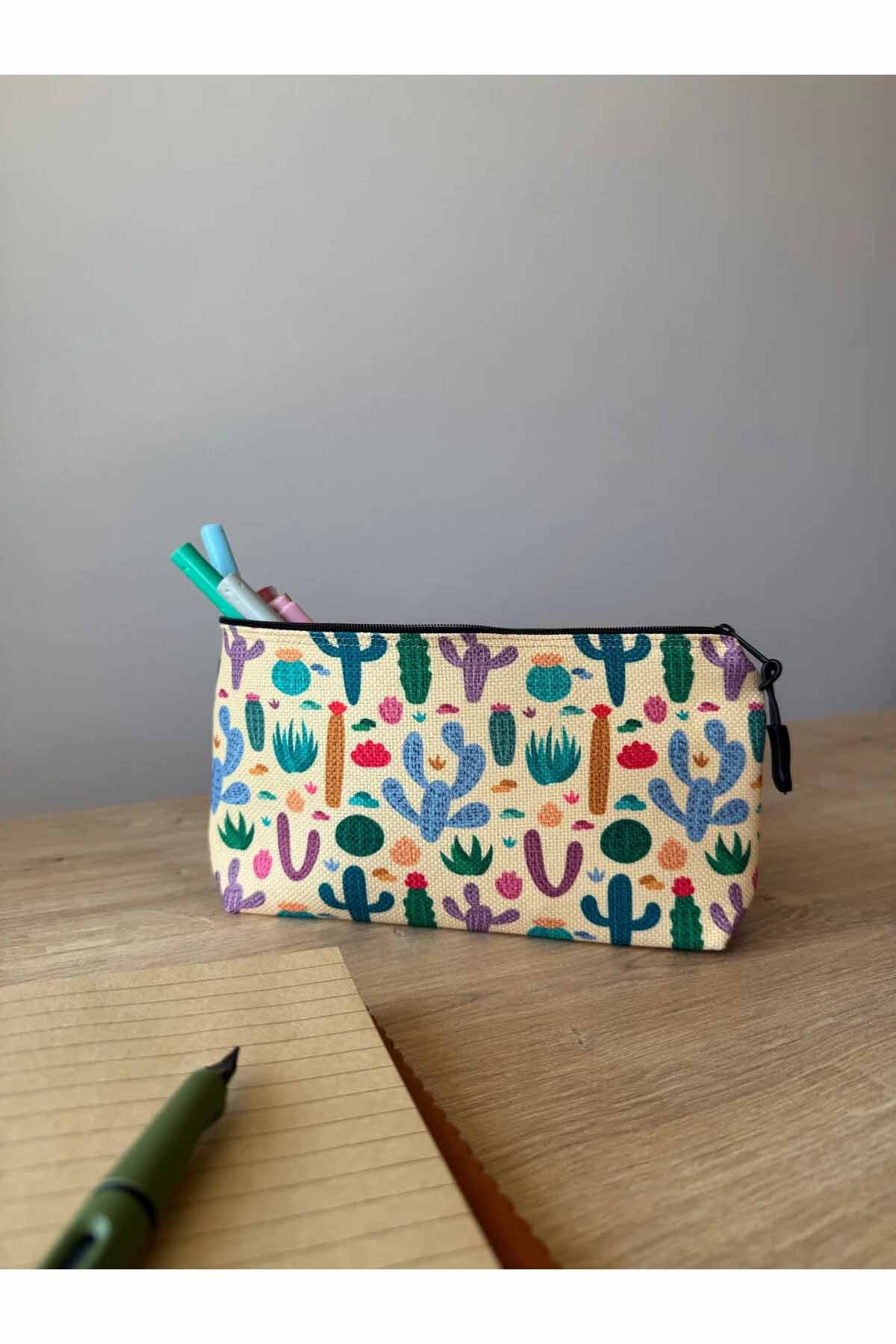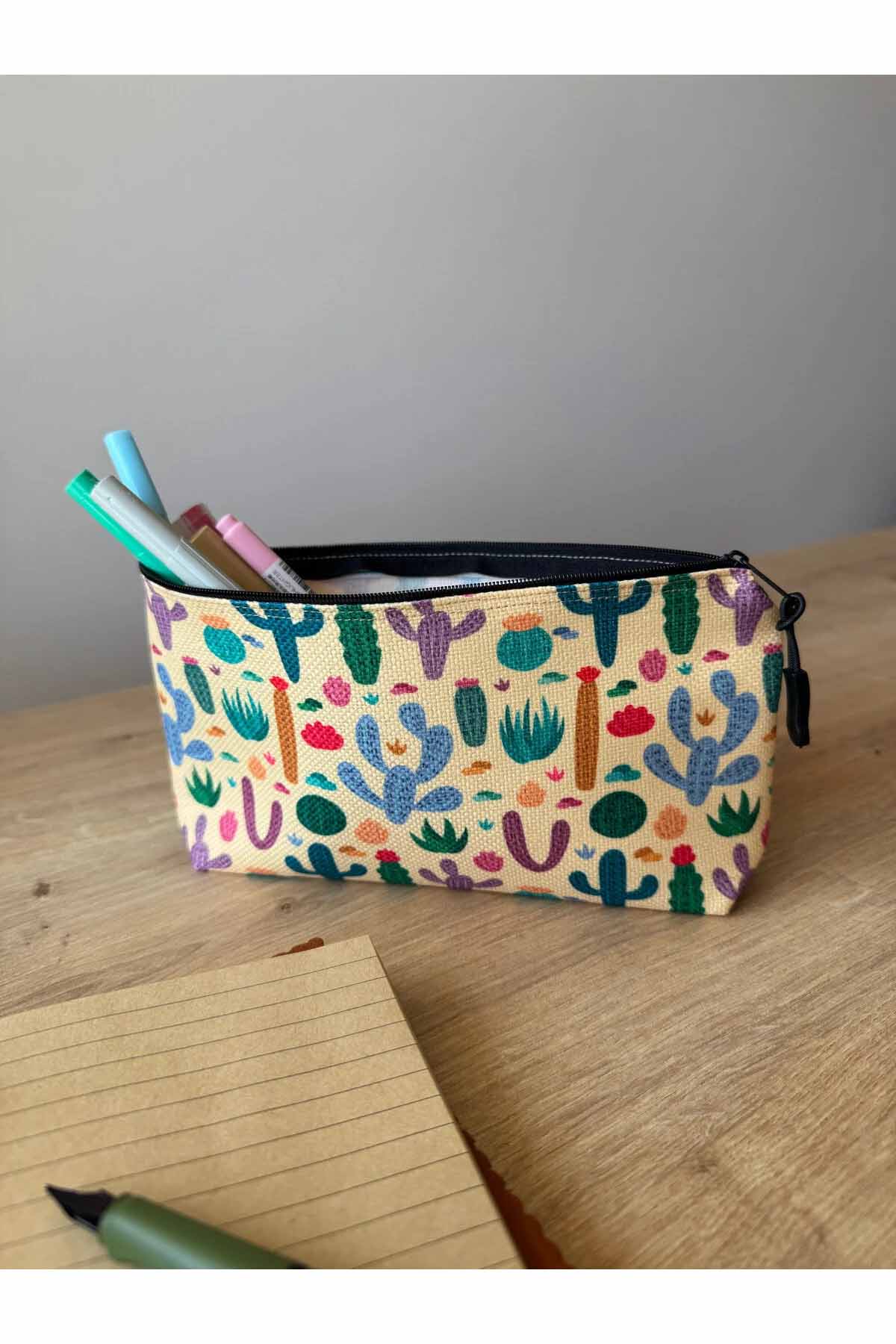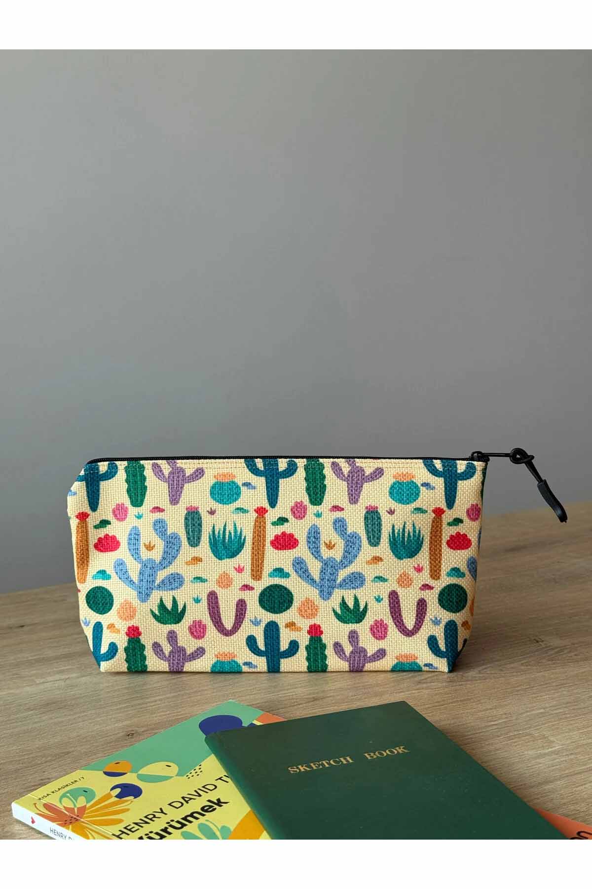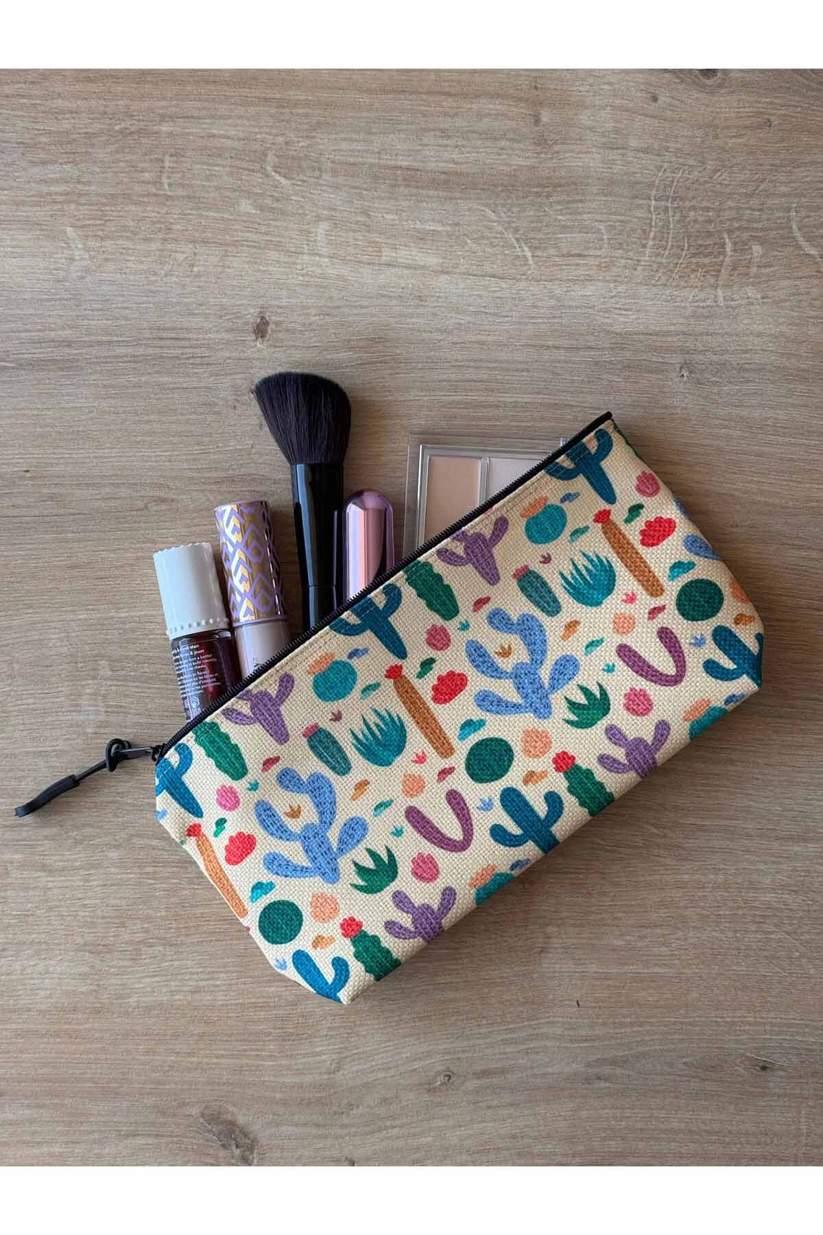Kaktüs Desenli Kalemlik Yıkanabilir 22x12 Ölçülerinde Körüklü Makyaj Çantası
